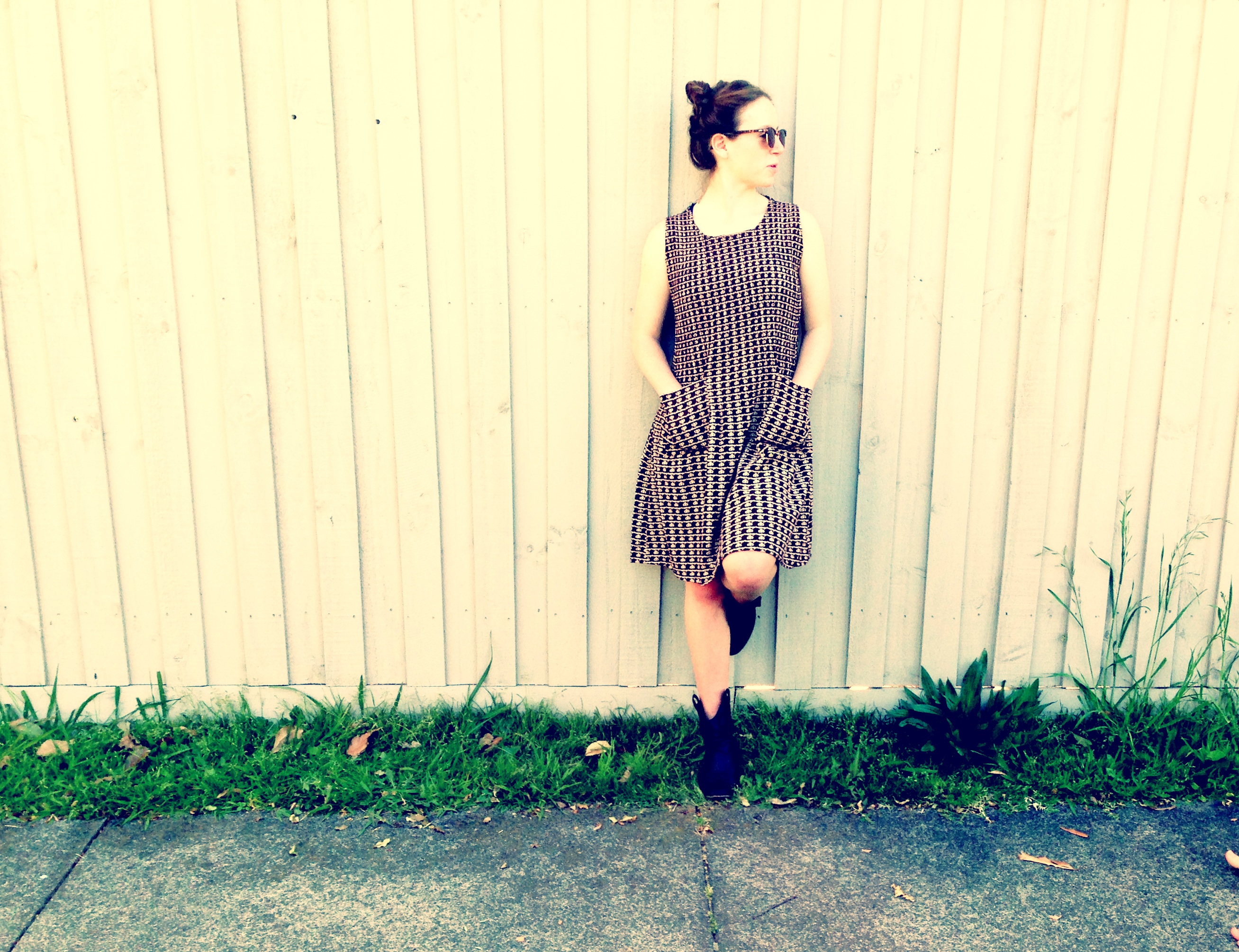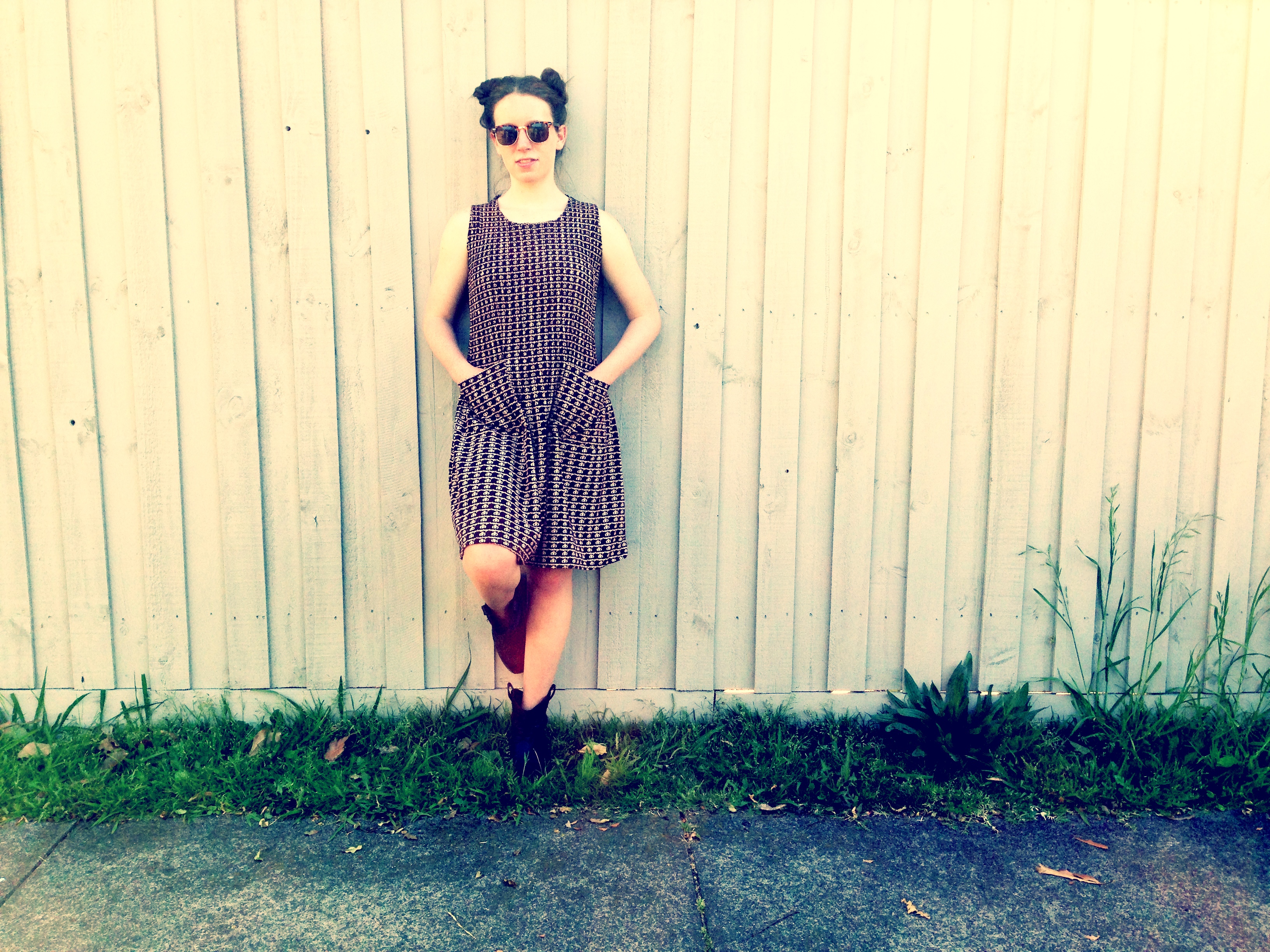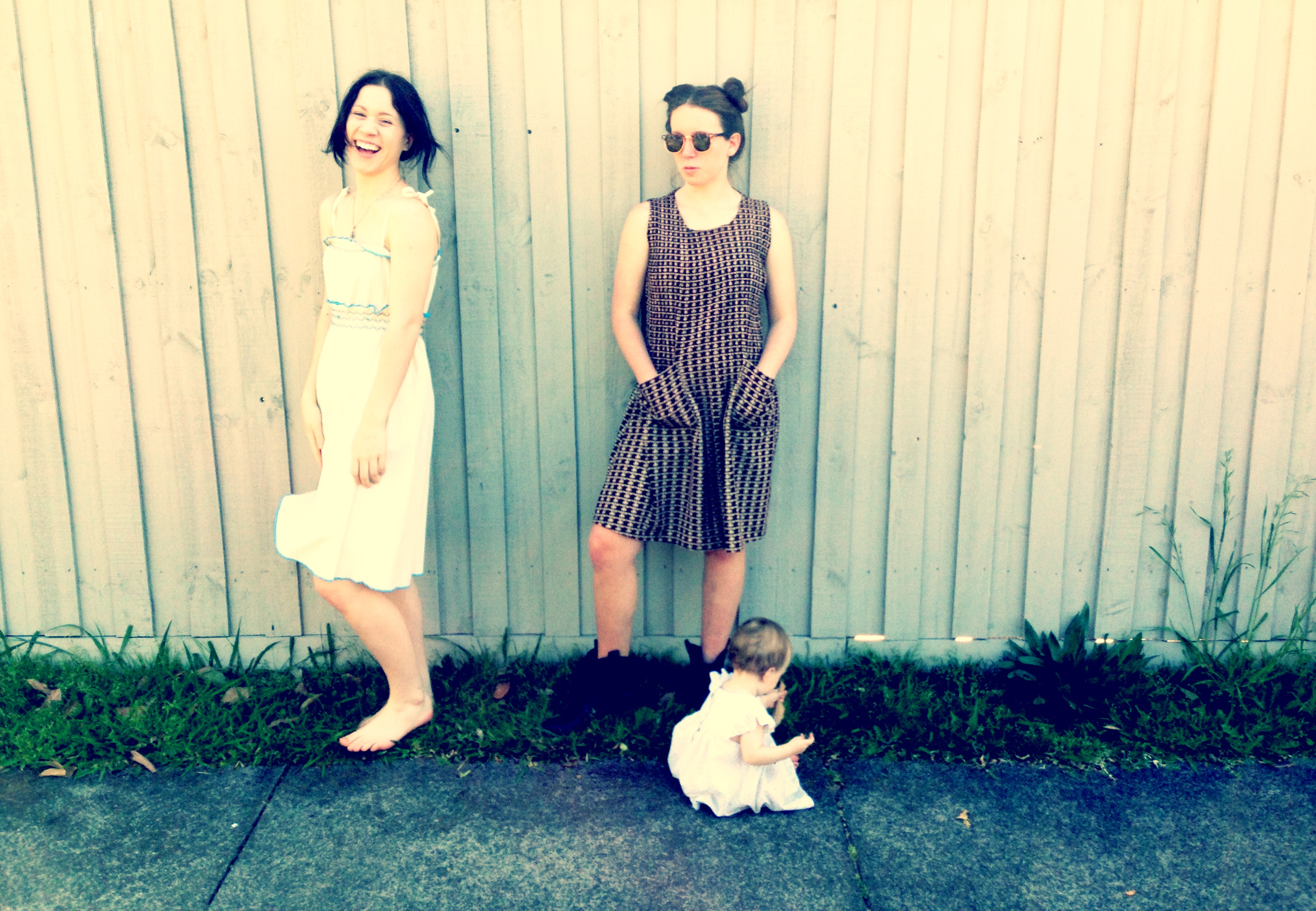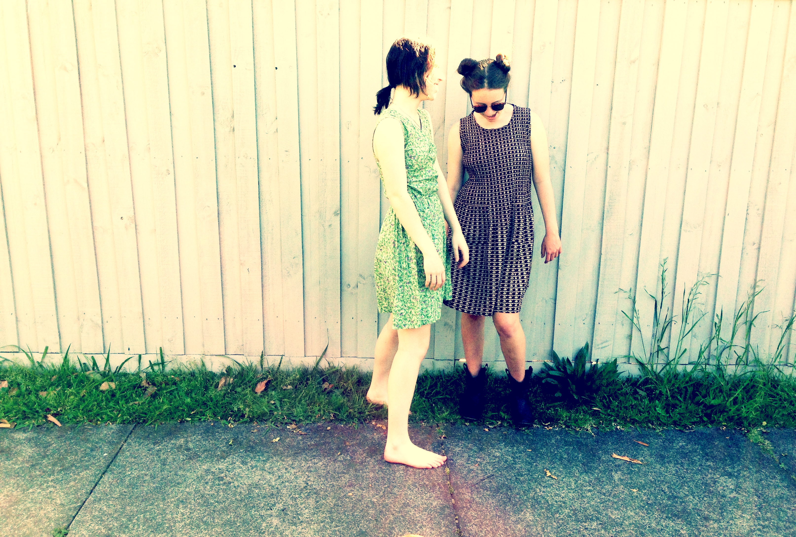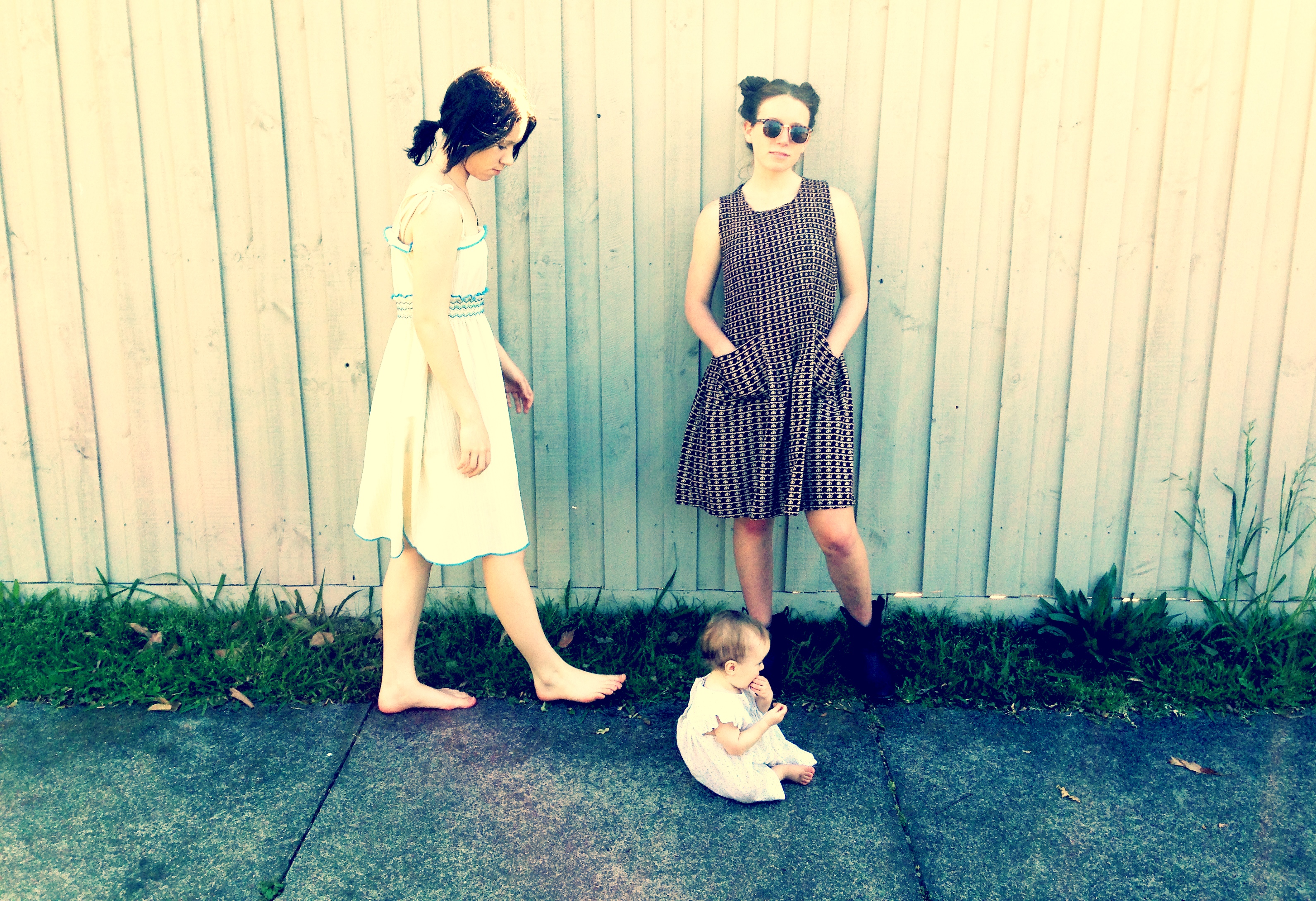 DEMI wears vintage white shoe string dress RETRO STAR MELBOURNE,SKYE wears Pre loved brown satin print dress RETRO STAR MELBOURNE,Boots pre loved CAMBERWELL MARKET MELBOURNE,sunglasses copy RAYBANDS style, GEORGIE GIRL wears preloved vintage baby doll dress,DEMI wears cotton print vintage style dress NEW RETRO STAR MELBOURNE.