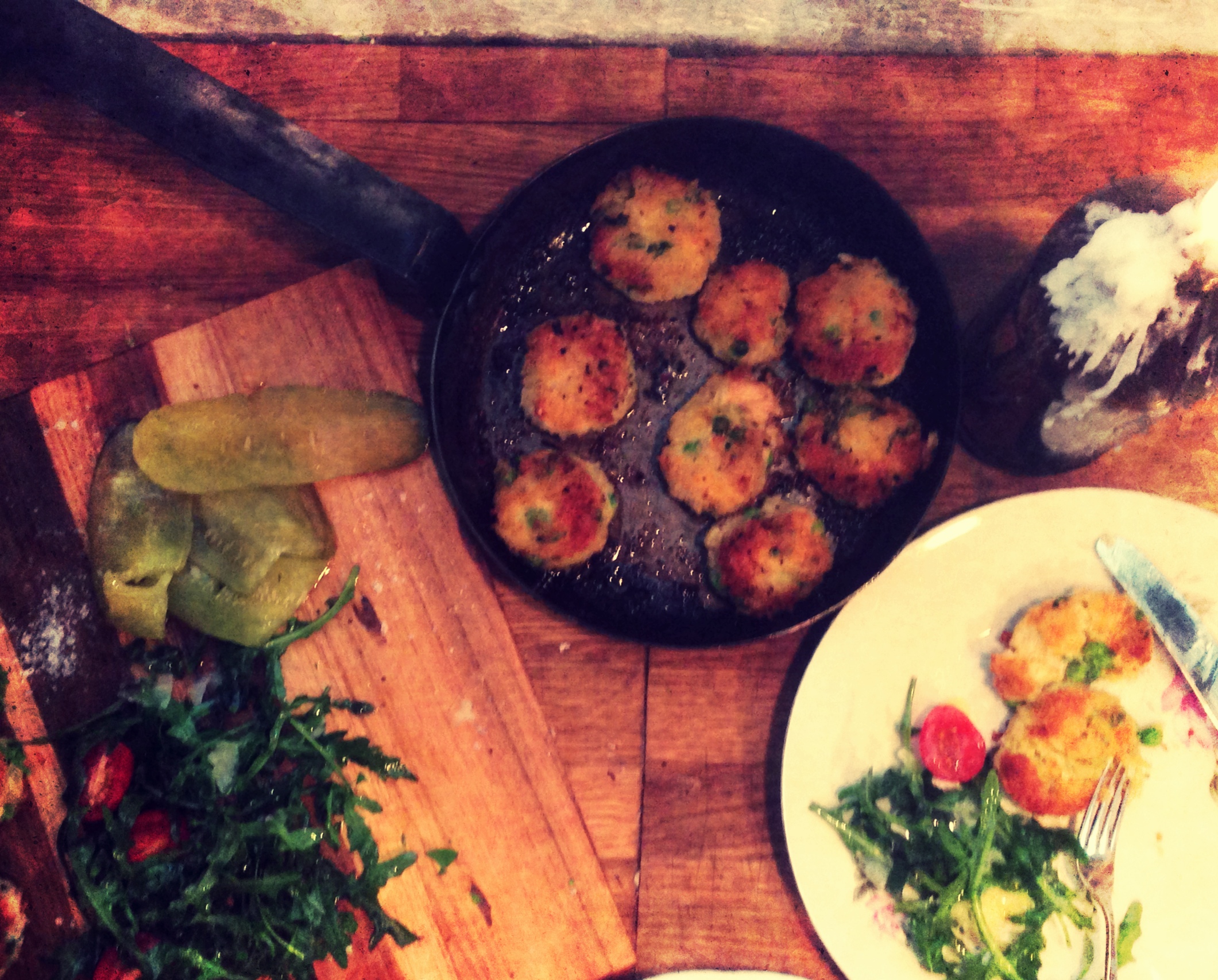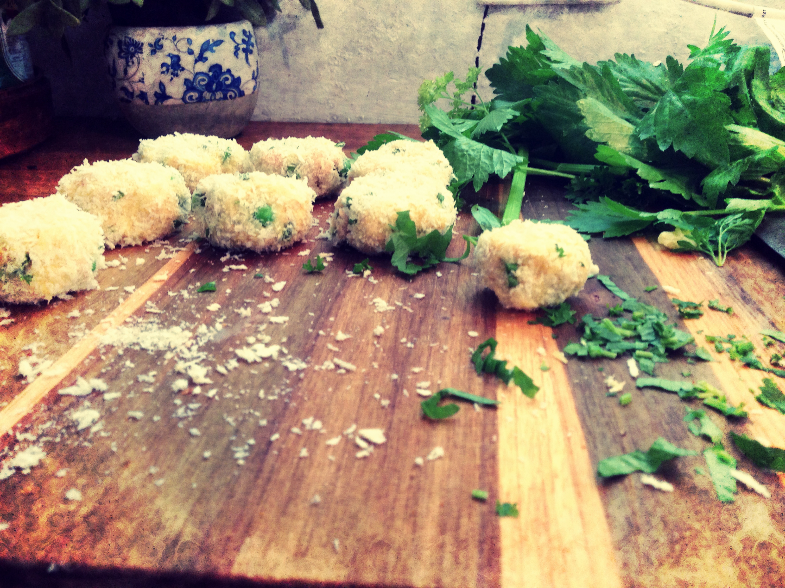 185grams tin tuna in olive oil,2 medium washed desire potatoes boiled with skin on,1/2 cup frozen peas,handful of chopped parsley,1/4 cup grated parmesan cheese, 1 free range egg,3/4 cup japanese breadcrumbs,salt flakes