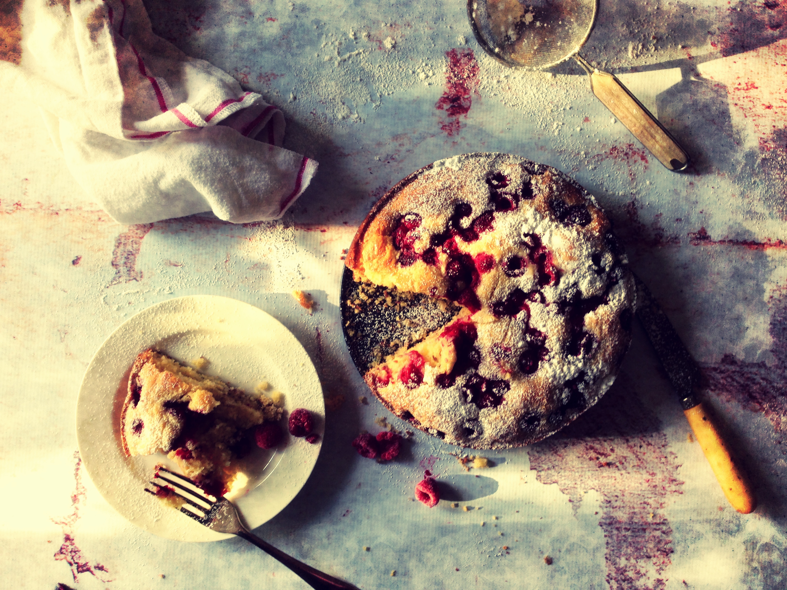 combine the softened butter with the caster sugar in a mixer and beat until light and fluffy. add eggs, flour, vanilla and milk, beat to a smooth batter consistency, then add the coconut. poor into a greased tin and top with raspberries. bake on the middle oven shelf at 175°C for 40 to 45 min.