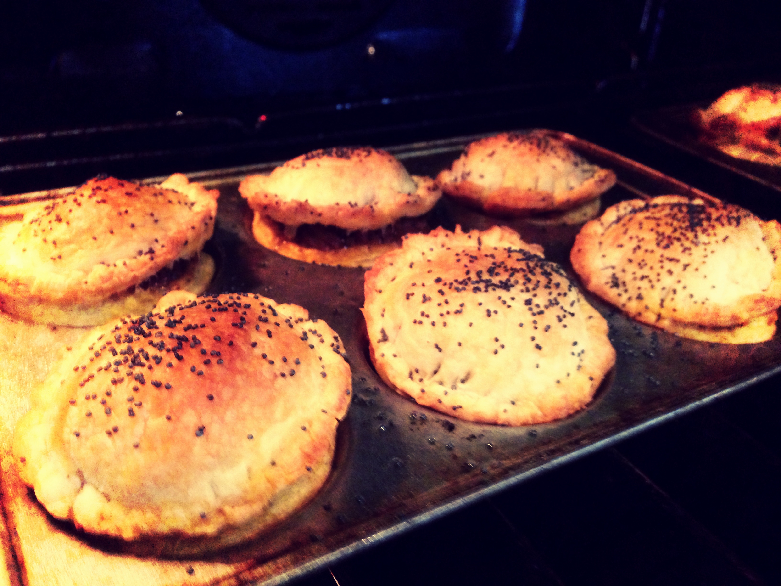 Pre heat the oven to 200°C fan forced. brush three muffin trays with olive oil this should make 18 pies. Have pastry sheets out of the freezer and allow to defrost for 20 minutes. Meanwhile heat a non stick fry pan with a little olive oil and brown the mince, add the finely chopped onion, cook for a few minutes then add the sauces, thyme and flour. If the mix is dry then add a little water. Simmer for 10 minutes, season to taste. While the mixture is cooling down, cut the pastry circles using an egg ring, you should get 9 circles to each sheet of pastry. Line the muffin trays with the pastry, then spoon the cooled mix into the pastry cases, there is no need to blind bake the pastry first. Place the tops on, pressing down around the sides with a fork. brush with olive oil, lightly prick each one a few times with a knife and top with poppy seeds. bake for 20 to 30 minutes or until the pastry is golden brown.