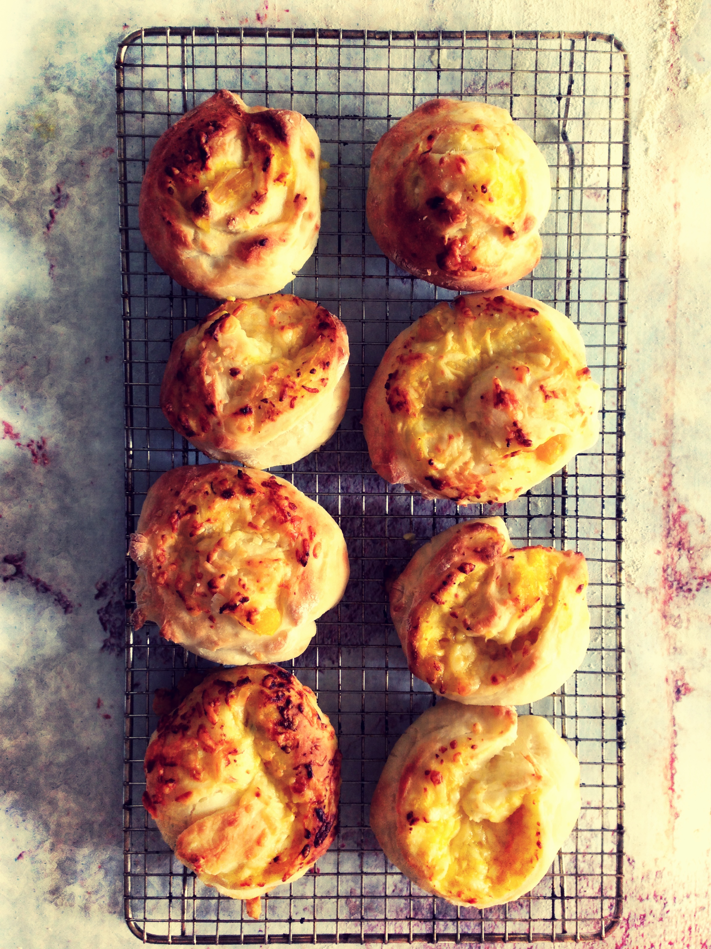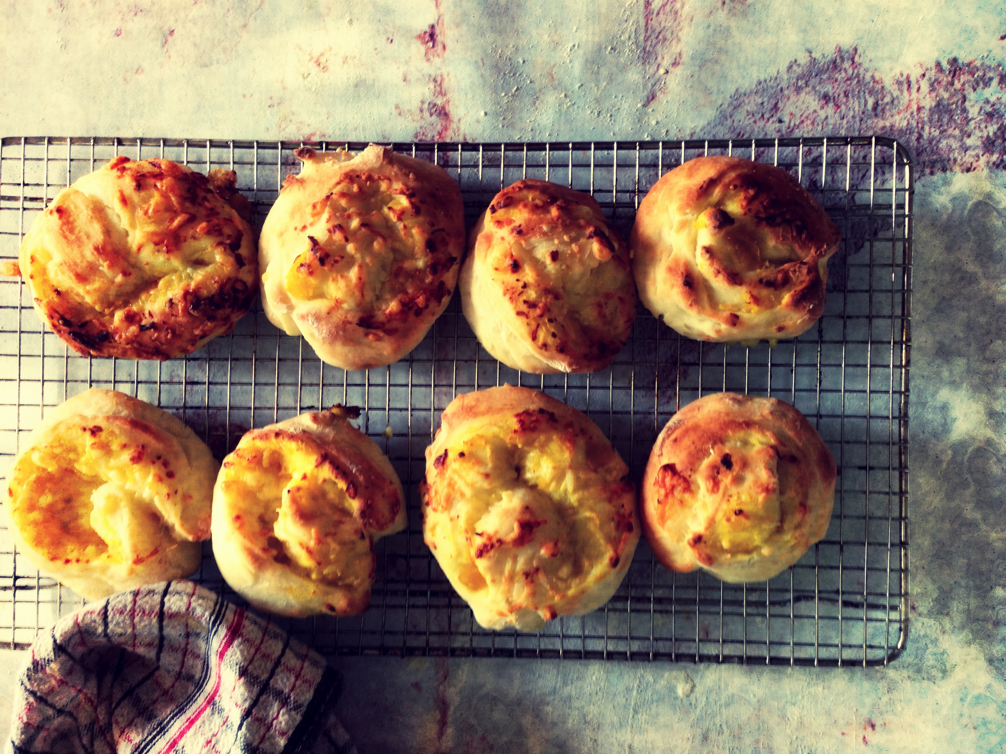 mix the yeast and the sugar in the warm water, let it stand for 10 minutes. put the bread flour, salt and oil into a bowl large enough for the dough to rise in. when the yeast mixture looks like its begining to activate add it to the flour mix. The dough will be very sticky, continue to mix for a couple of minutes, then with some flour on your hands shape the dough while keeping it in the bowl. Cover with cling film and a tea towel and place in a warm spot until the dough has doubled in size. During winter i place the bowl over a ducted heating vent, or on top of the oven. Heat the oven to 200 °C fan forced. once the dough has risen pull it out of the bowl onto a lightly floured surface, then gently stretch the dough out length ways until approxamitly 2cm thick. spread generously the sweet pickles over entire surface of the dough and then the grated cheese. i used a nice vintage cheese, any cheese will work. roll the dough like a sausage then with a sharp knife slice into 3cm pieces. turn each piece on its side revealing the filling on greased oven trays, allowing room for rising. lightly salt and place in the oven for 20 minutes. allow to cool on wire racks to avoid the bottoms going soggy.