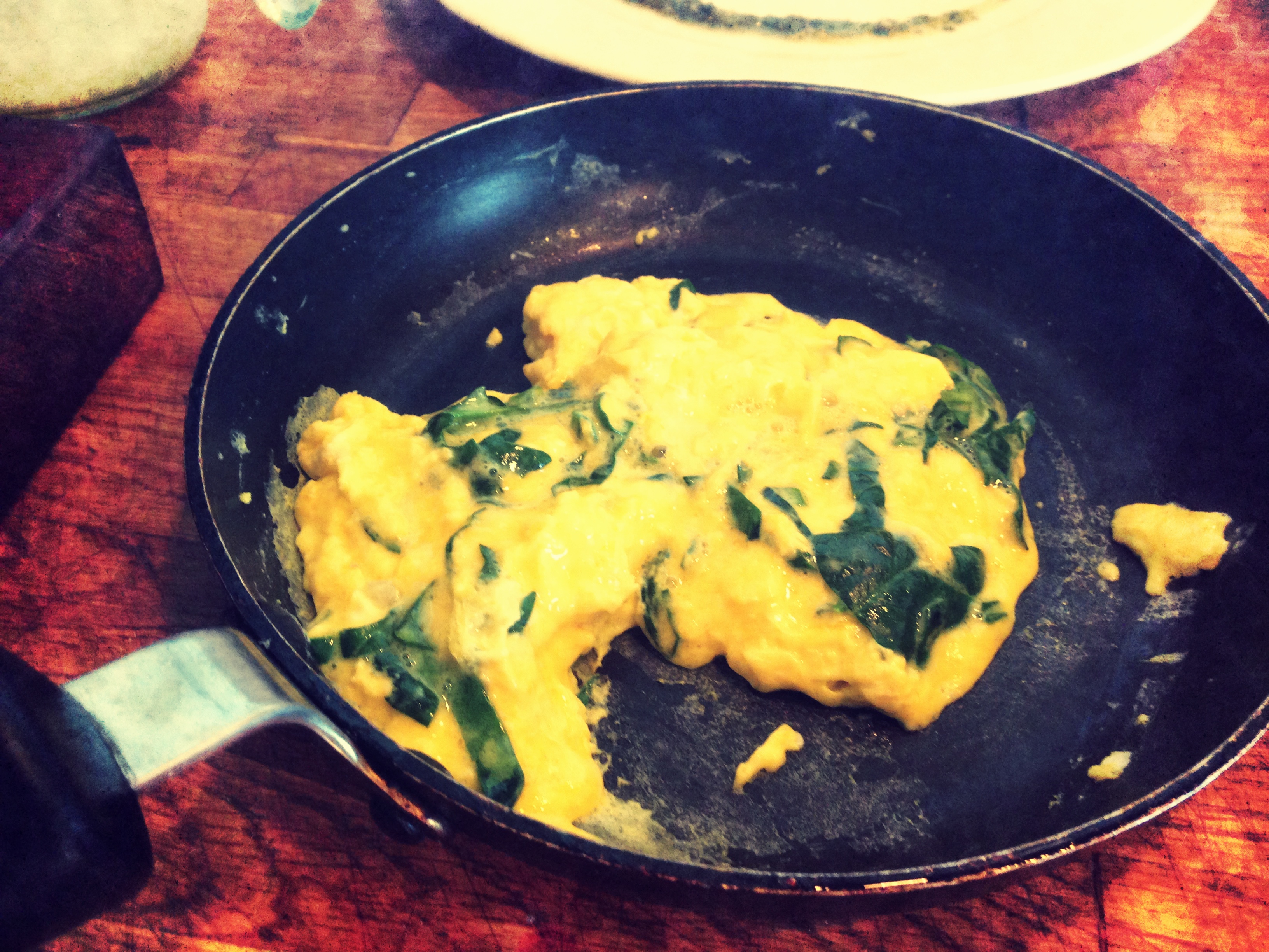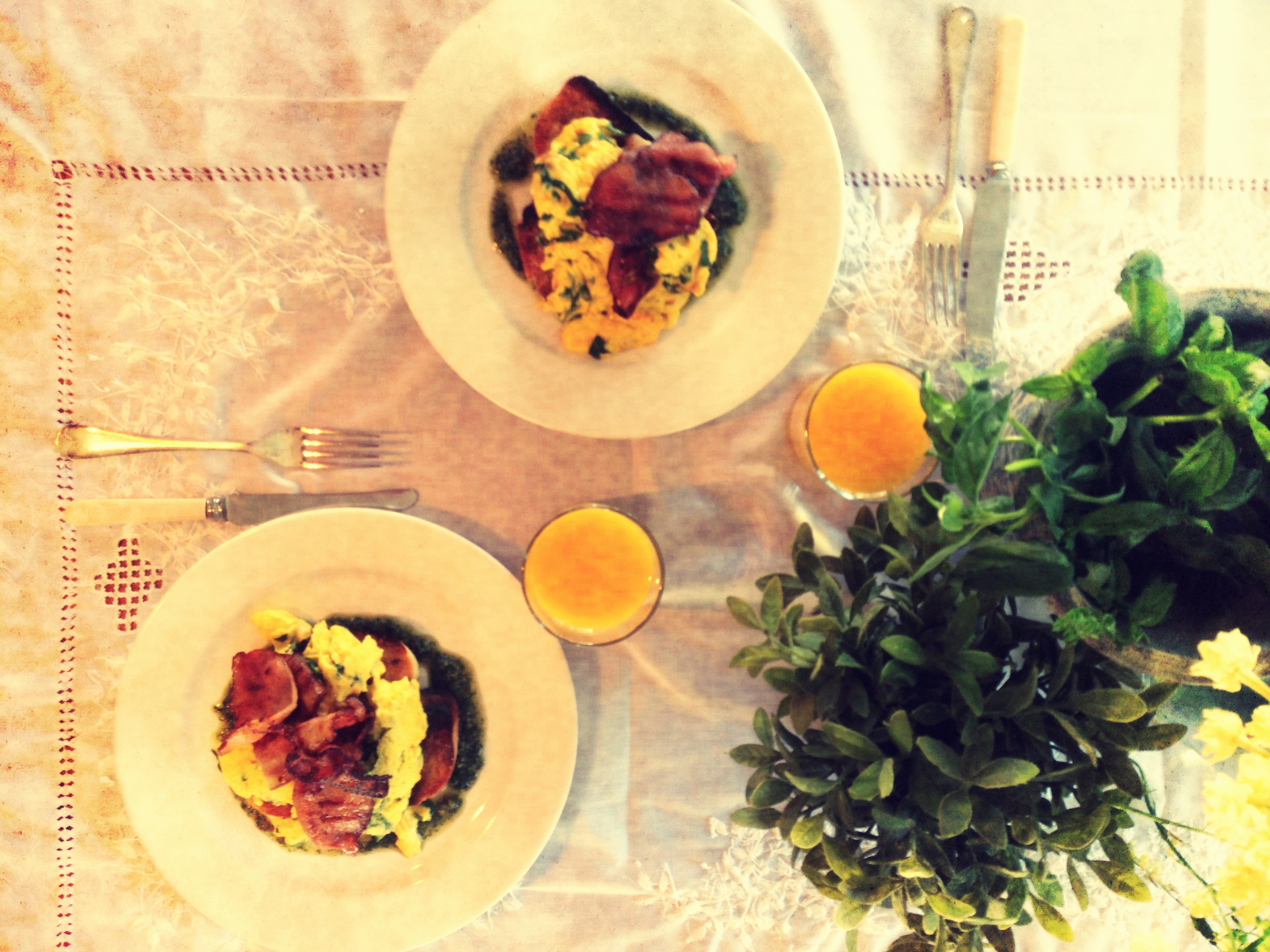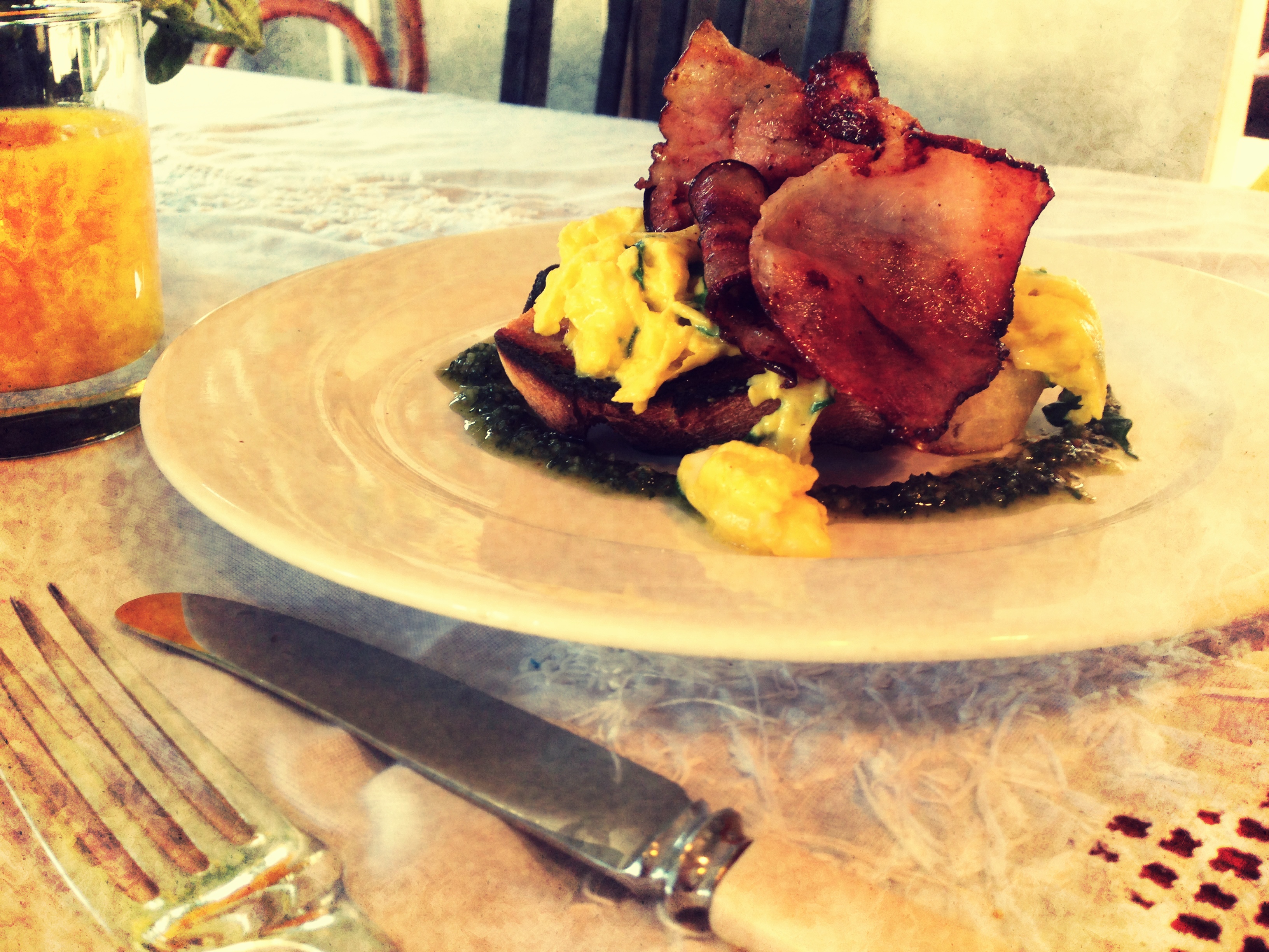 2 free range eggs per serve, dollop of cream,fresh spinach,ciabatta bread, free range bacon,pesto, salt, cracked pepper