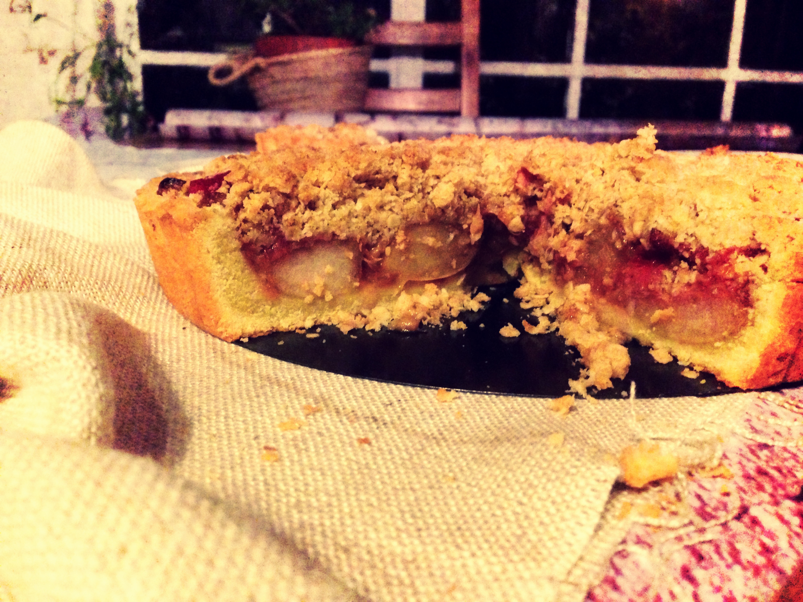 prepare the pastry. Chop rhubarb into 2cm pieces disregard all leaves and peel if preferred,however i never do as it often looses the rich red colour of the rhubarb. place rhubarb in a baking tray with the juice of the orange and half of the brown sugar and the butter, bake in the oven at 200 for approximately 20 minutes or until softened and caramelised. cut the apples and remove the core leave the skin on, poach them in just enough water to cover with the remaining sugar until just soft, then drain the liquid, set aside. Remove pastry from the fridge and on a lightly floured surface roll out to approximately 1cm thick, put the rolling-pin onto the pastry and gently pick up one side and drape over. this allows you to gently pick up the entire pastry sheet using the pin and lay then over your greased pie tin. at this stage you will find that pieces have broken away. Gently press the pastry into the bottom and sides of the tin this is where its alright to stick and paste and fill the gaps. finish off the edges with a knife then return to the fridge for 10 minutes. when the rhubarb and apple have cooled, spoon both mixtures into your pastry case. top with the crumble and bake at 180 for 20 minutes. serve warm with cream.