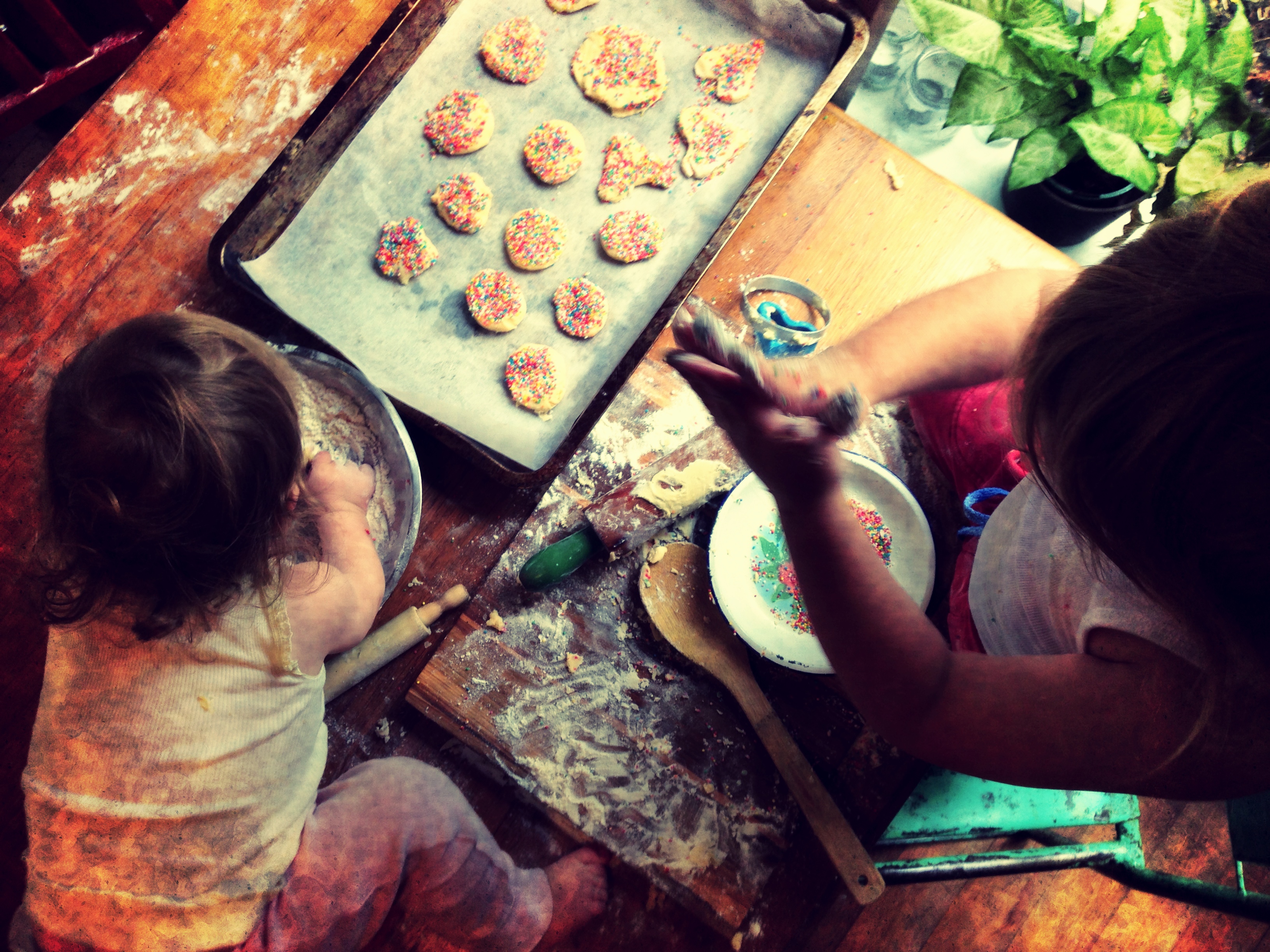 method: Beat butter and sugar in a kitchen mixer until light and fluffy. Add the egg and vanilla extract and beat well, then add the flour and baking powder and mix until a ball of dough forms. At this stage is good to roll dough into a ball and wrap in cling film and put into the fridge to chill for an hour, however this step is completely unacceptable to my toddlers so we always skip it and go straight to here, on a lightly floured surface roll out the dough to 1/2cm thick with cookie cutters cut out shapes and gently press into the sprinkles and lay onto baking tray lined with baking paper. If dough is extra soft from skipping the chilling step, you can, with lightly floured hands roll teaspoons of the mixture and then press them into the sprinkles. Bake for 10 to 12 minutes at 180°C or until the edges are slightly browned.