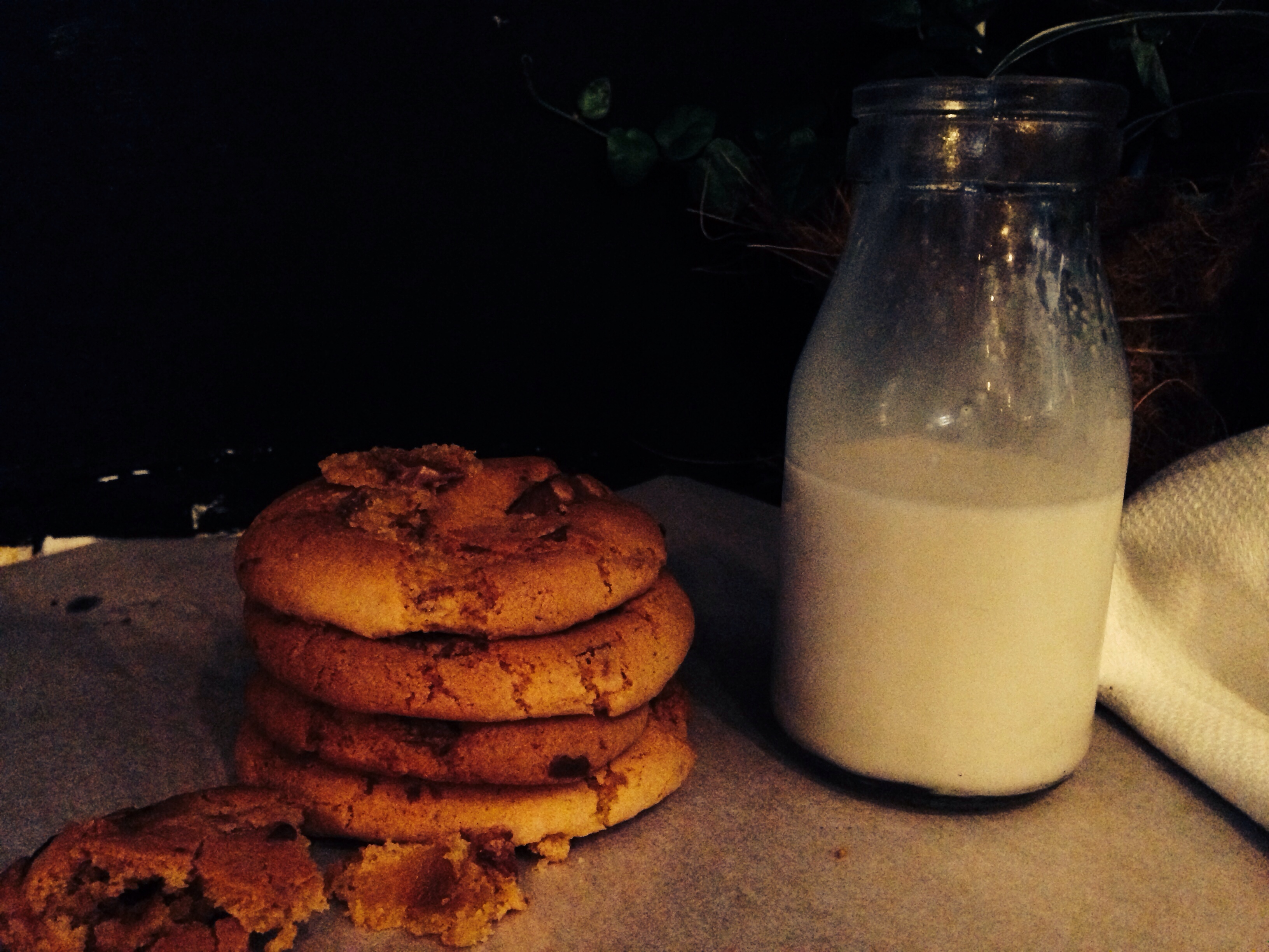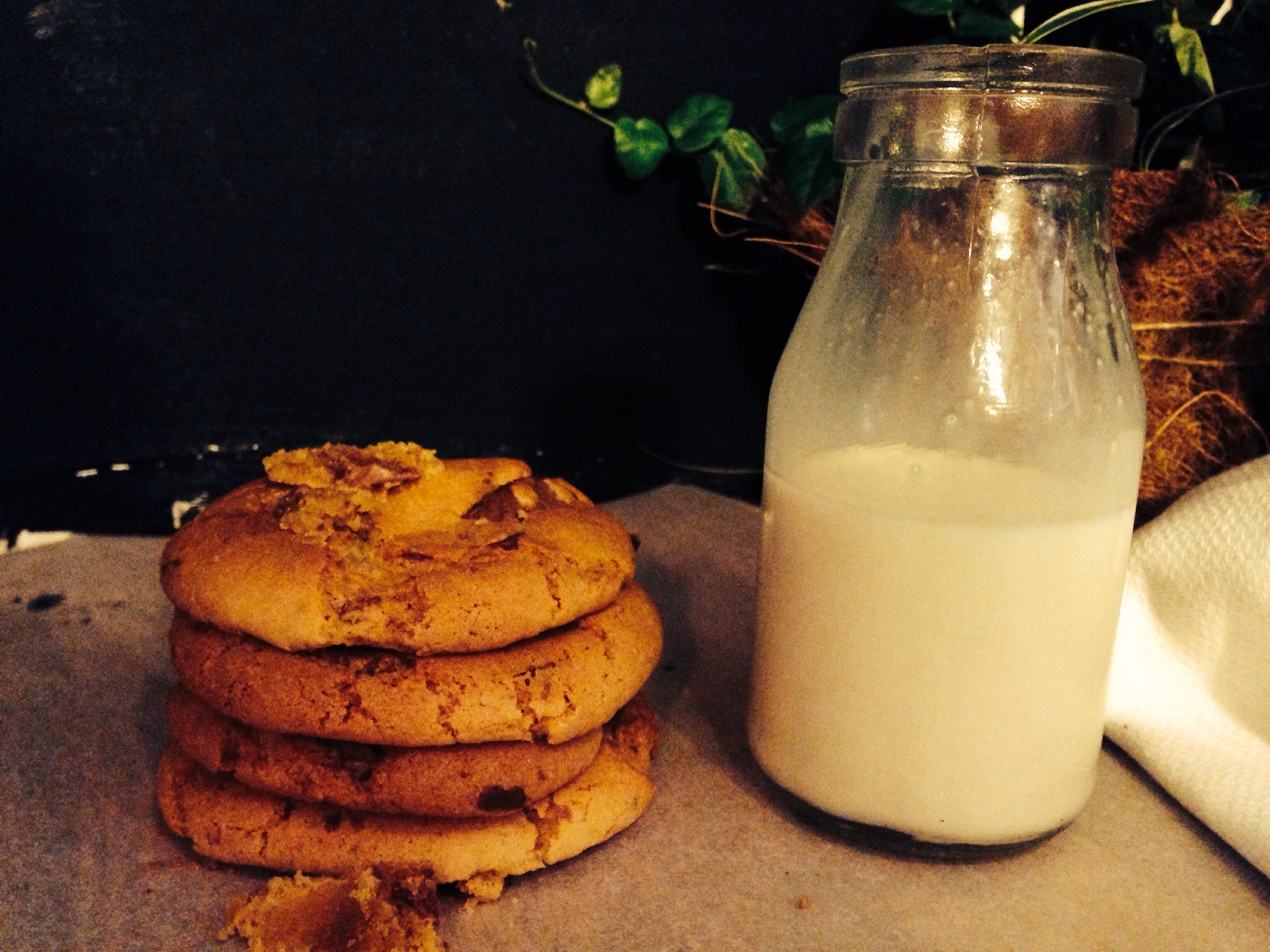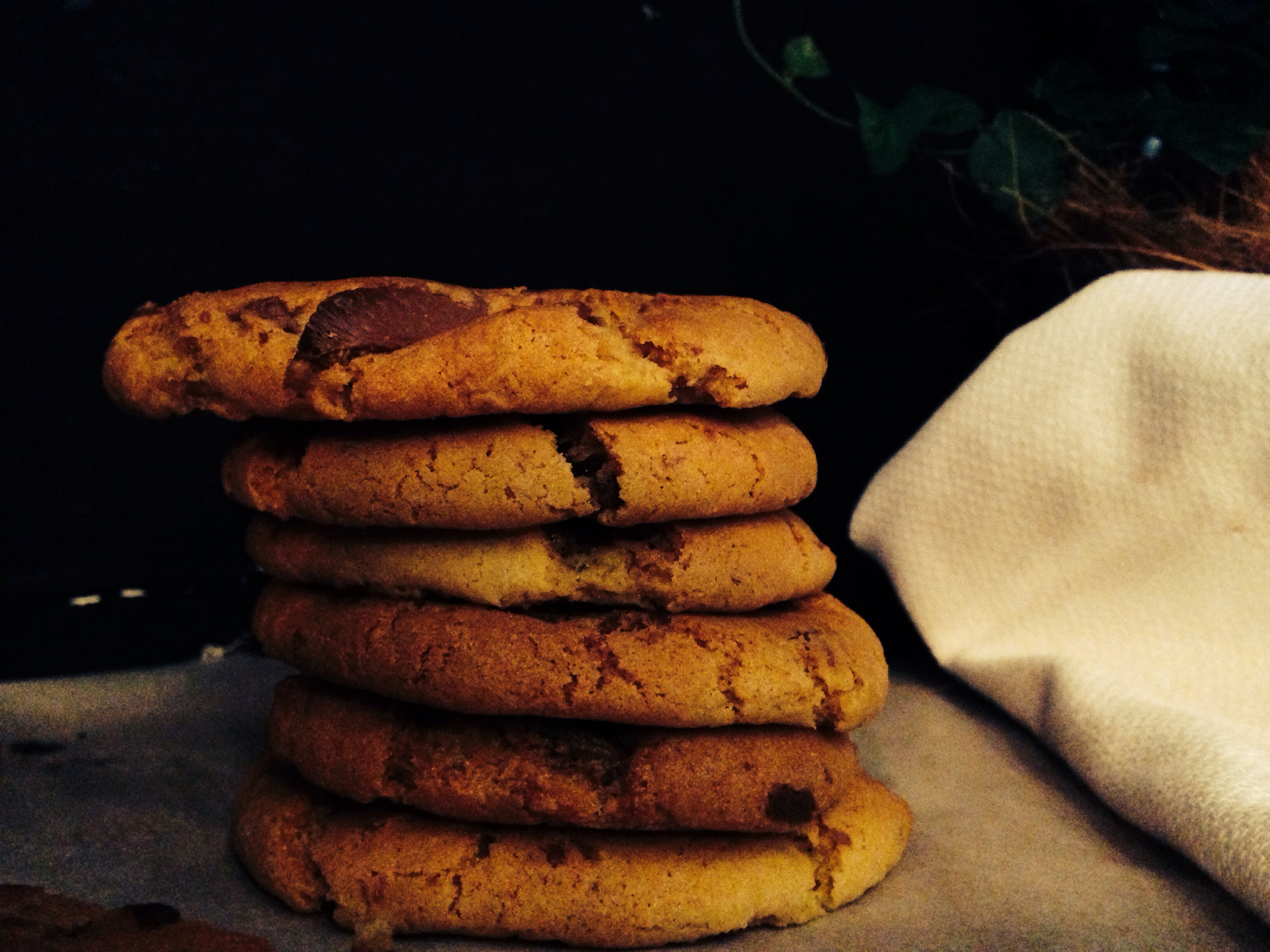 method: pre heat oven to 160°C. melt butter over a gentle heat, then set aside to cool slightly. In a mixing bowl combine the sugars and then add the butter, Mix well and add the lightly beaten egg, add the flour and baking powder mix until combined. Roughly chop the chocolate and add to the mix. Place tablespoonfuls onto a backing tray lined with baking paper allowing enough room for spreading. Bake for 12 minutes or until lightly coloured on the top. Allow to cool for a few minutes before transferring to a baking tray or eating. Cookies are most delicious eaten while still warm, or if saving for later they can be microwaved for 40 sec to regain their chewy texture.