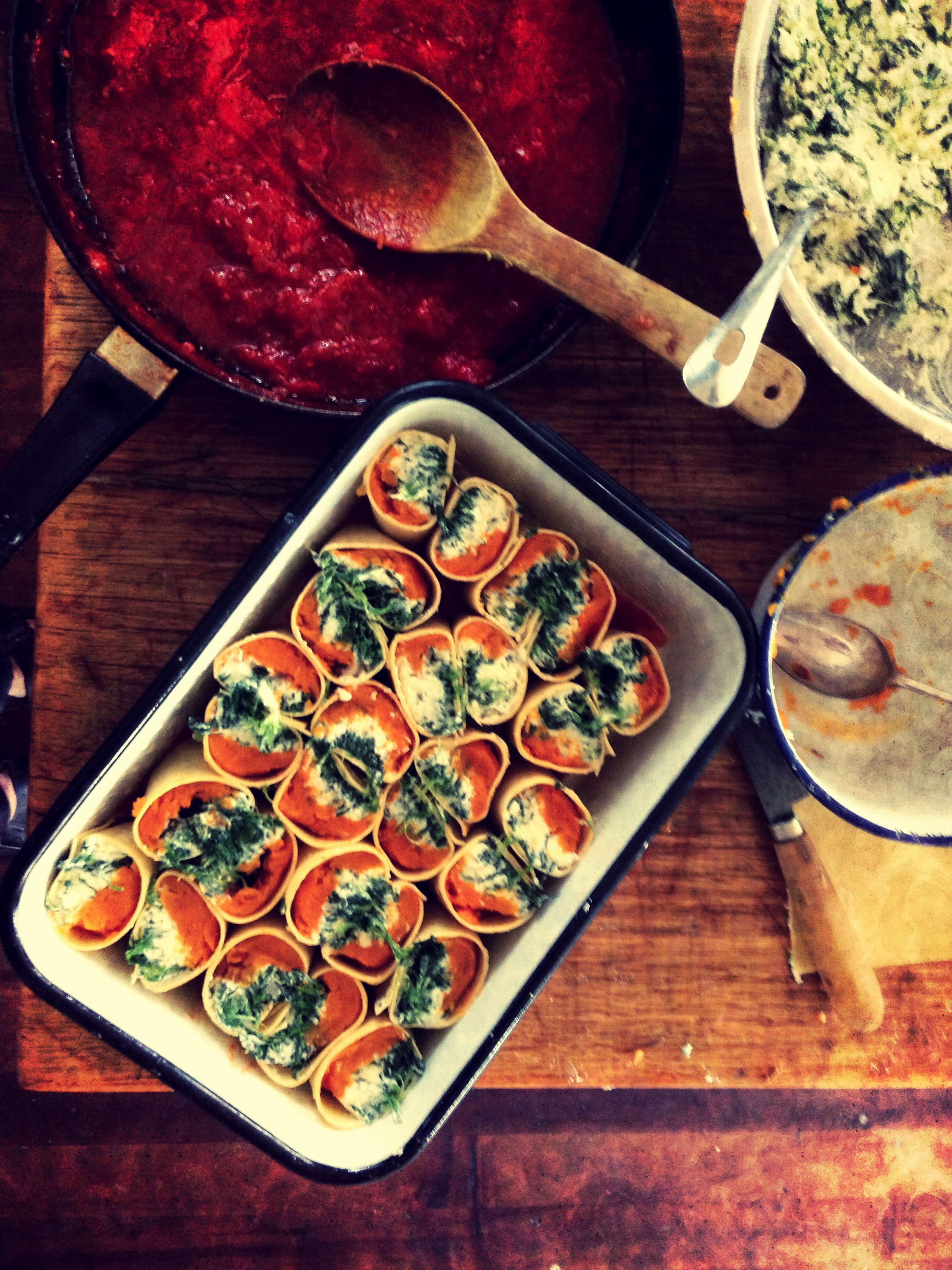 On a clean work surface , lay out pasta sheets facing length ways away from you. working quickly so the pasta doesn’t dry out, evenly divide and spread the pumpkin over the sheets. Then add a layer of spinach and ricotta and then crumble over the feta. Roll each sheet up and the cut evenly into four chunks and place facing up into half of the tomato sauce in a deep baking tray. Add remaining sauce over the top and place sage leaves and freshly grated parmesan cheese. Bake for 35 to 40 minutes in the oven until golden and crisp.