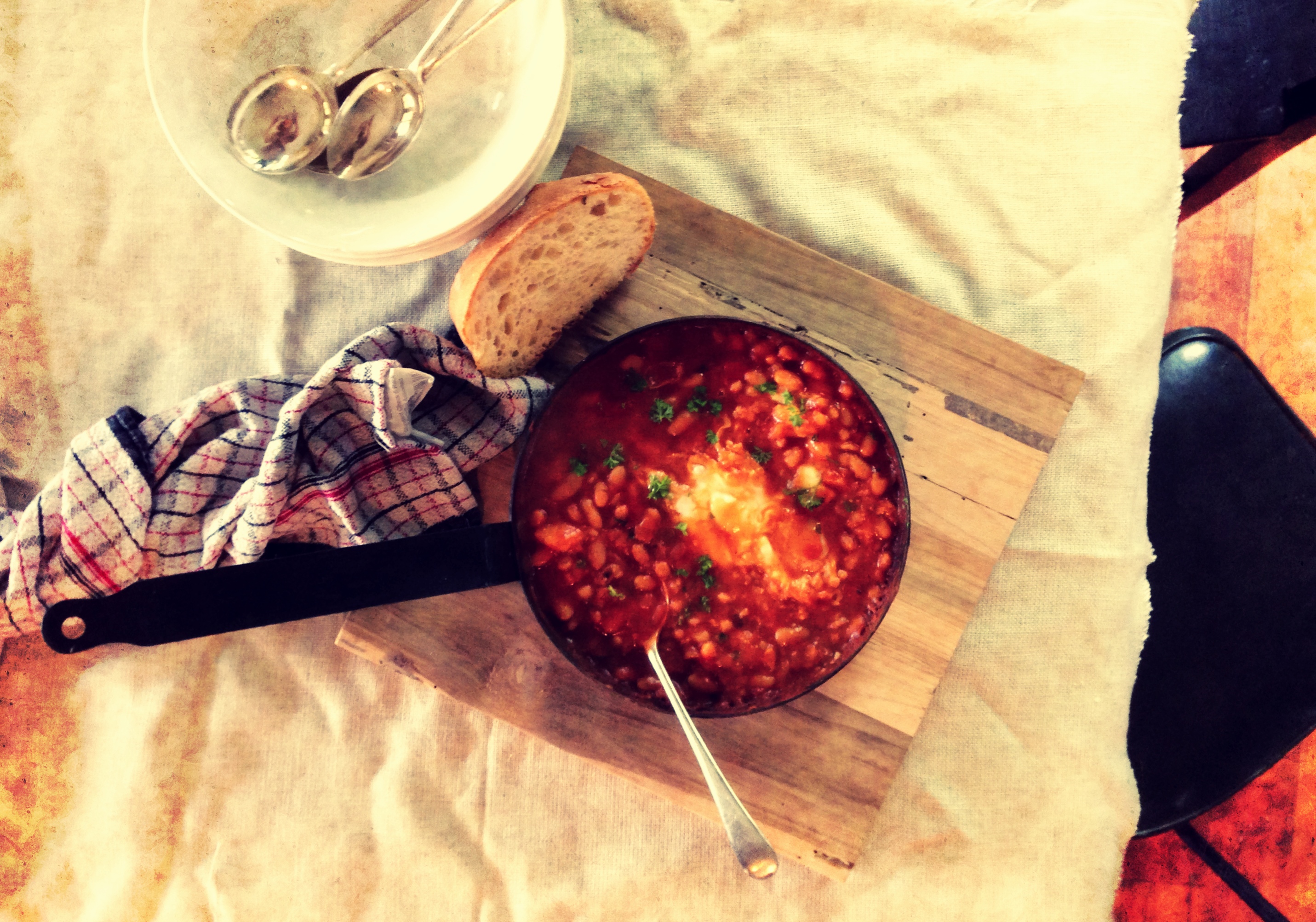 This is a fantastic quick weeknight dinner option and left overs for breakfast a couple of days later when the flavours have developed to their full potential, is even better. I tend to make this dish without the bacon most of the time to cater for my vegetarians and it really doest seem to impact on the flavour at all. We often have this dish with scoops of creamy mash potato and fresh bread, its real comfort food for those winter nights or it is just as yummy served with flat bread and sour cream.