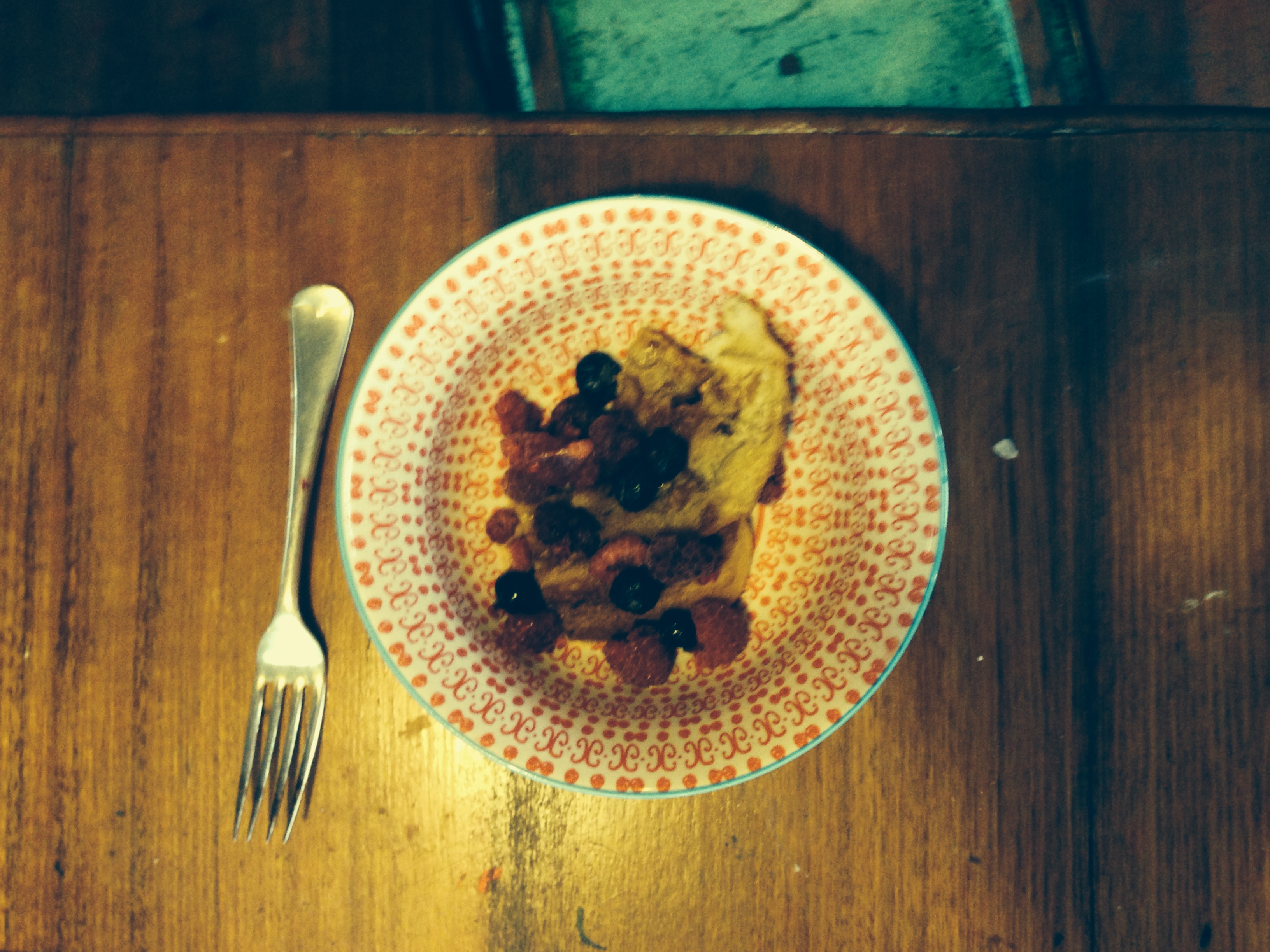 ingredients: Loaf of pasta dura or ciabatta bread thick sliced,3 free range eggs, 2Tlb cream, butter, 2tsp caster sugar, 2tsp cinnamon,1 tsp maple syrup, blue berries, raspberries