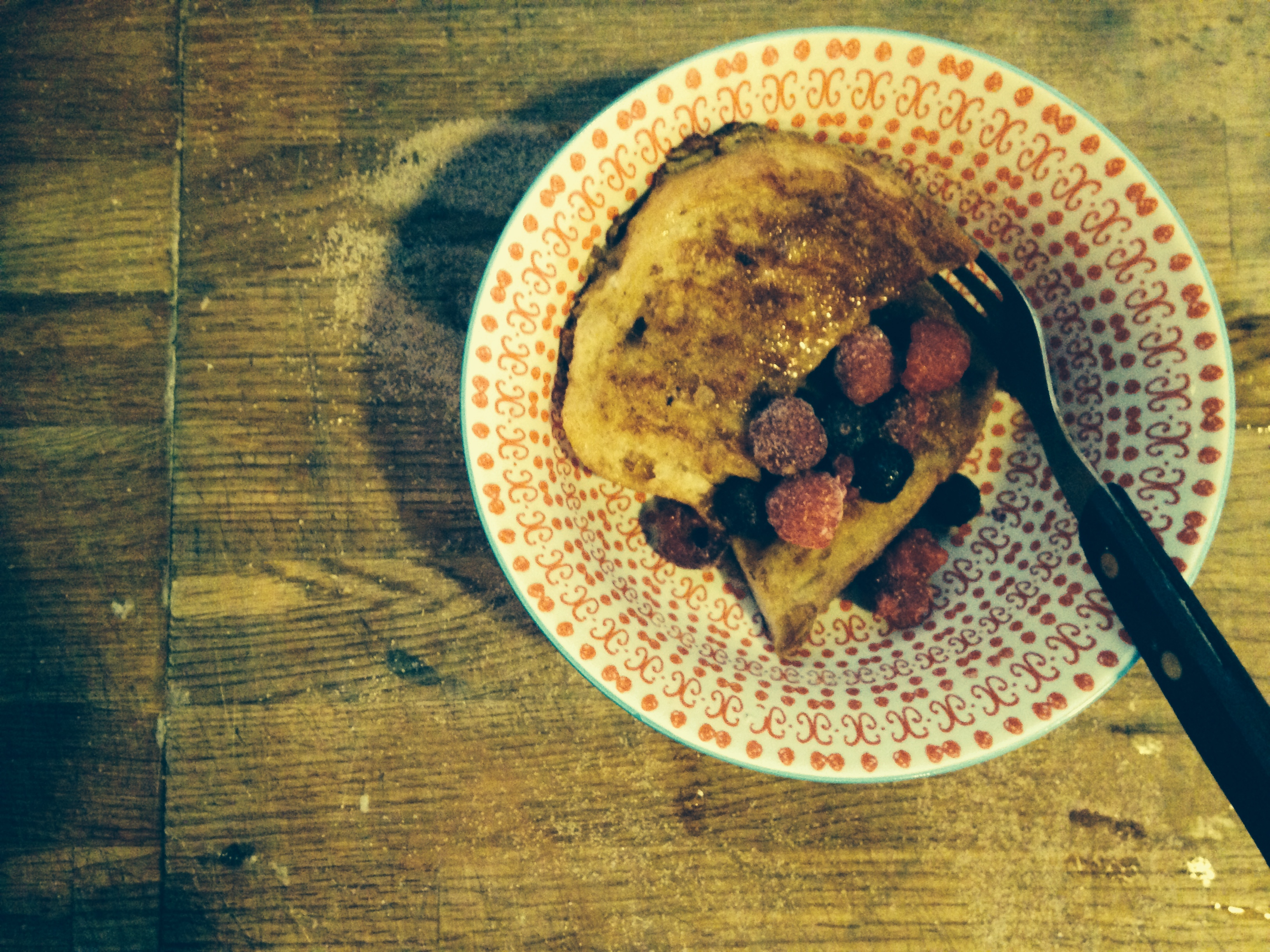Method: slice bread and combine the sugar and cinnamon onto a plate. Mix eggs, cream and syrup with a fork. Heat a non stick grill pan with a dollop of butter. Soak each slice of bread in the egg mix and then cook on the pan, flipping once the bread is nice and golden. While still hot, lay the bread in the cinnamon sugar-coating both sides. Top with berries and a drop of butter.