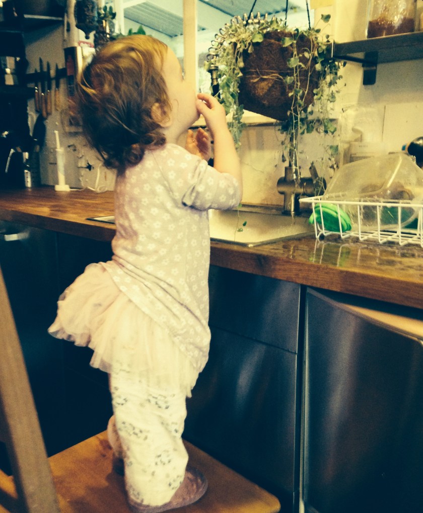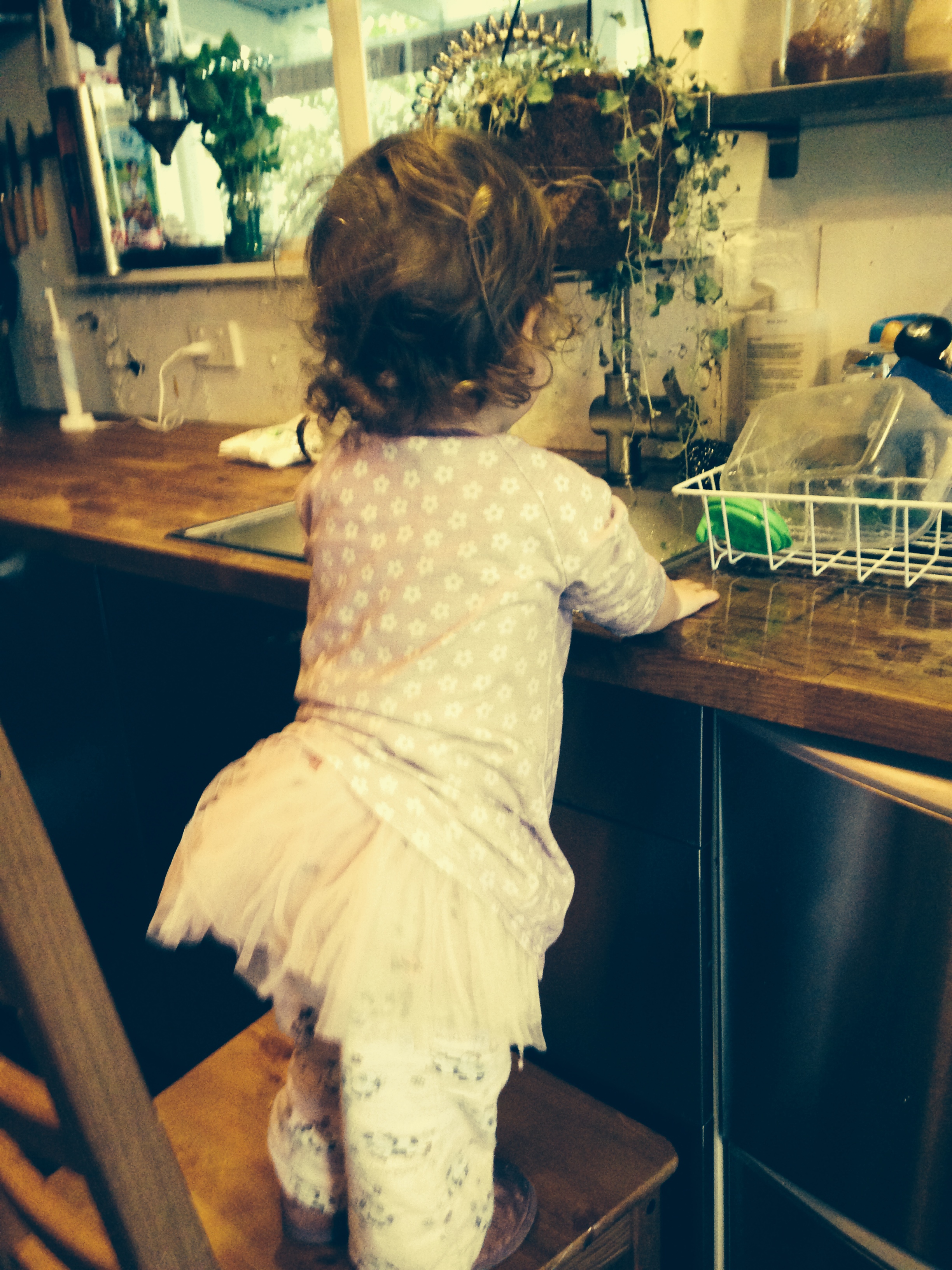i have placed a small sticky note above our sink with these words roughly scribbled on it. since the unfortunate dying of our beloved dishwasher it is taking some great convincing in our house hold that this could be an opportunity presenting itself. Thich Nhat Hanh, a practicing zen buddhist monk, uses washing the dishes as an opportunity to practice prayer and meditation. Here, looking out the kitchen window from our simple home front, I see children learning to cooperate, the sharing in household tasks,learning life skills, growing up. It seems though that the only person i have been able to successfully persuade in this new approach to washing up is our Georgie, at 16 months she’ll happily do the rounds of dishes morning, noon and night. Thank god for my little domestic goddess.